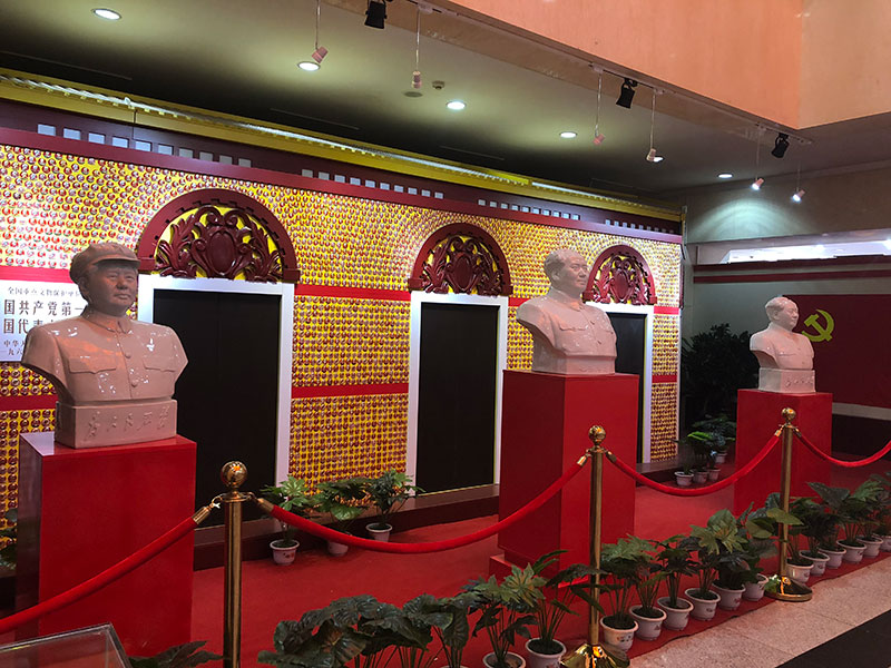 陳列館展廳內由成百上千枚像章組成的“東方紅,太陽升、“學習雷鋒好榜樣”字樣,還有由2萬枚像章組成的“東方紅太陽升”巨幅標語,“好好學習,天天向上”等主席語錄和長城、國旗、五星造型等也顯得蔚然壯觀。